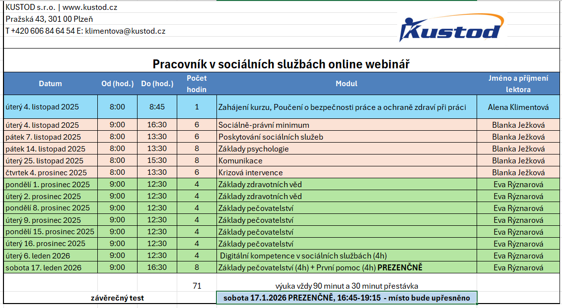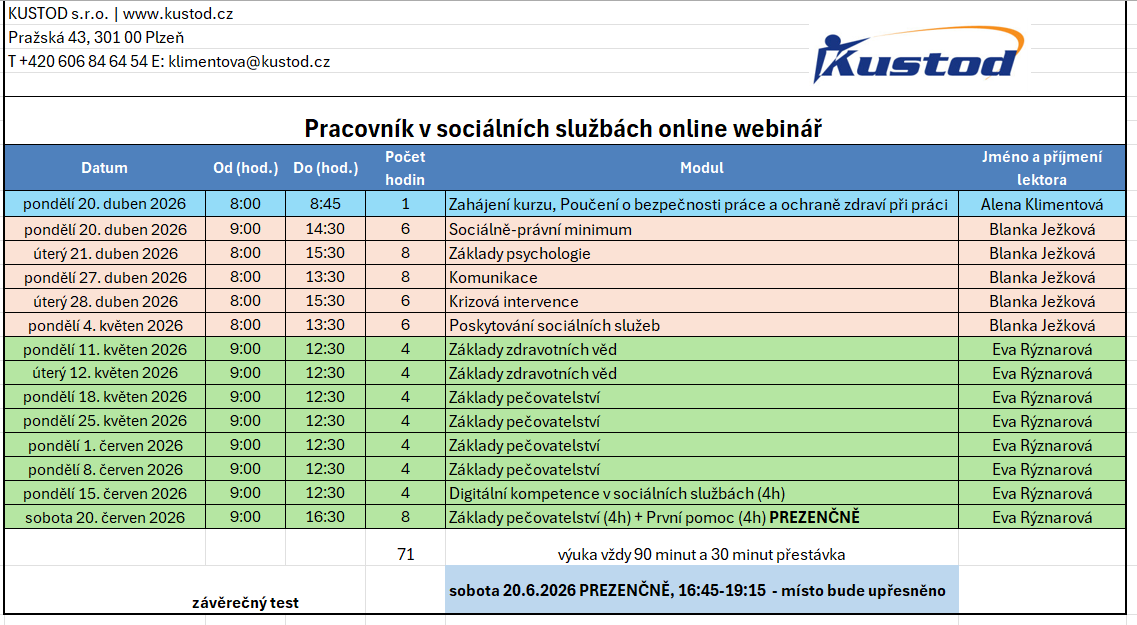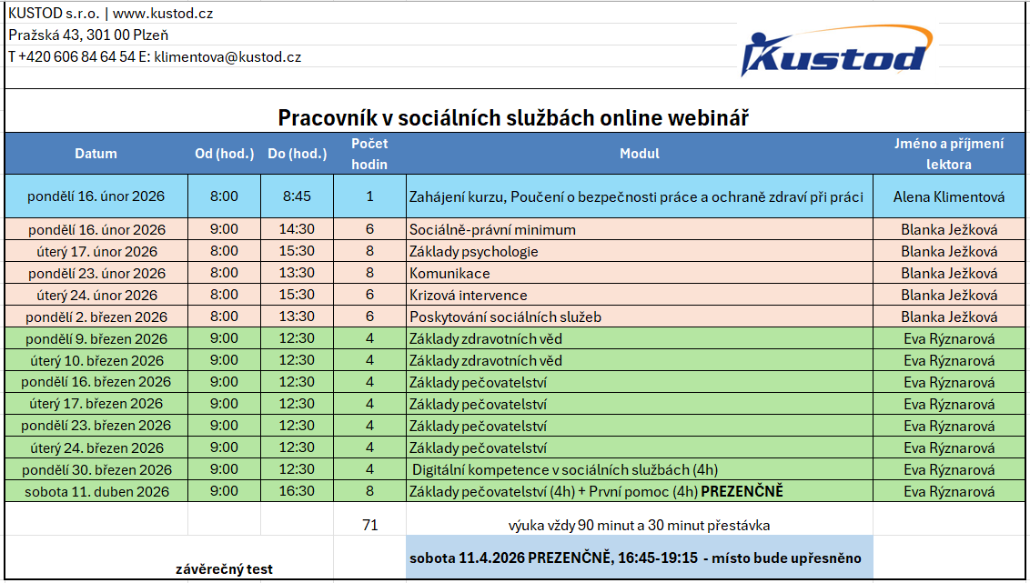 Rozložení výuky: online + 8 hodin prezenčně; praxe v zařízení poskytující sociální služby v místě bydliště